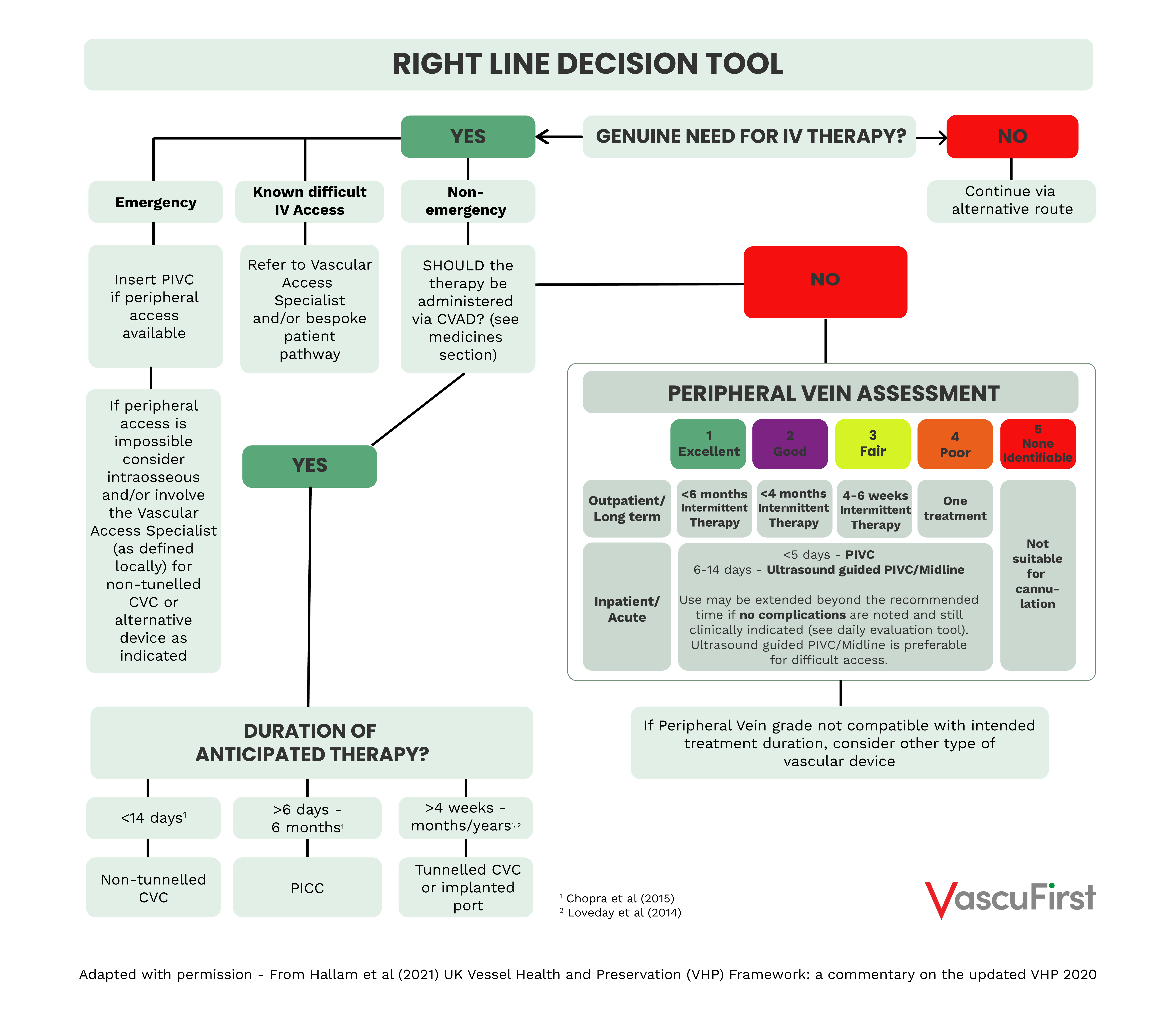 - A right line decision tool for device choice is based on vein quality, drug choice and duration of treatment